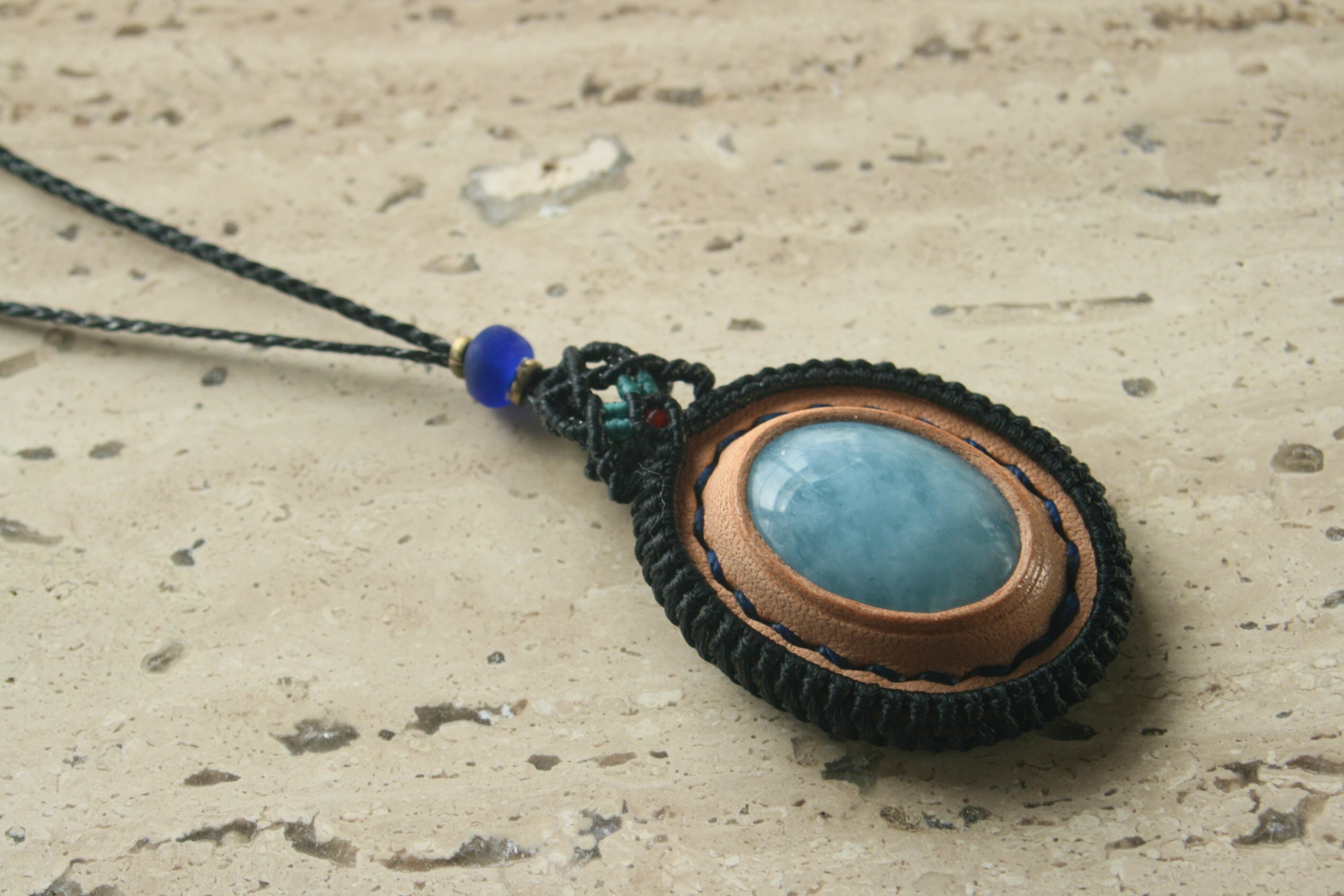 3月誕生石【アクアマリン】天然石の革包MACRAMEネックレス