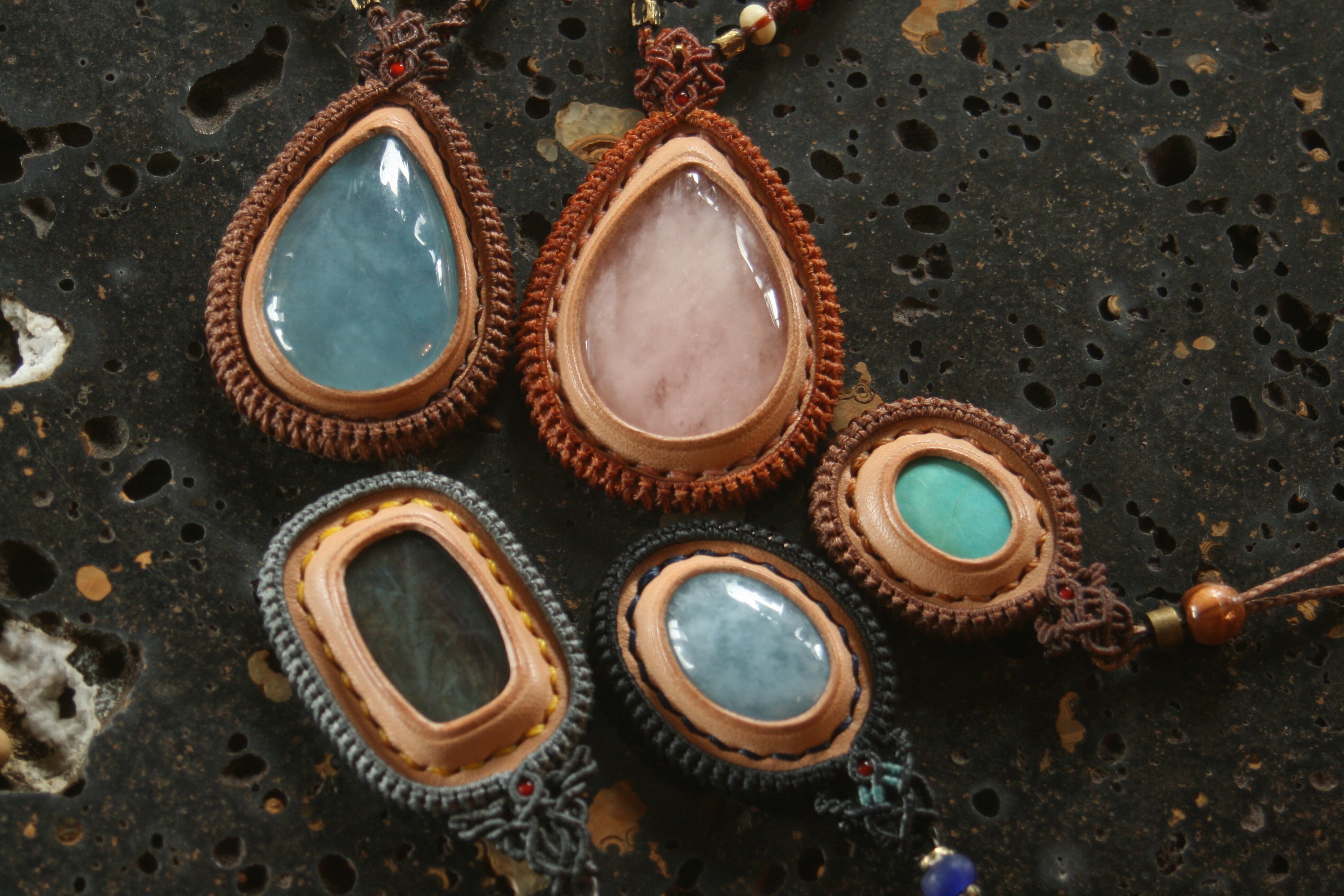 【ターコイズ】天然石の革包MACRAMEネックレス