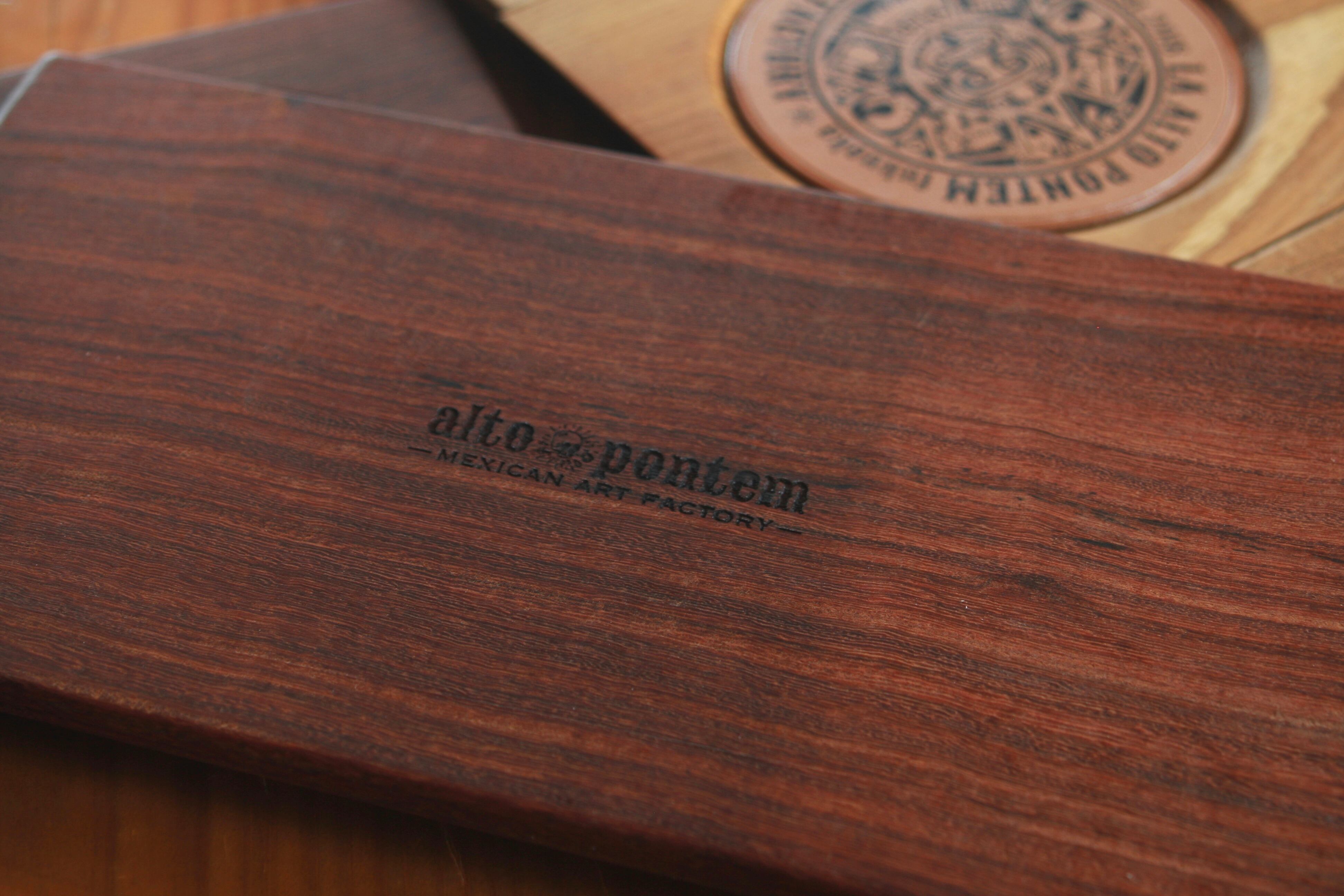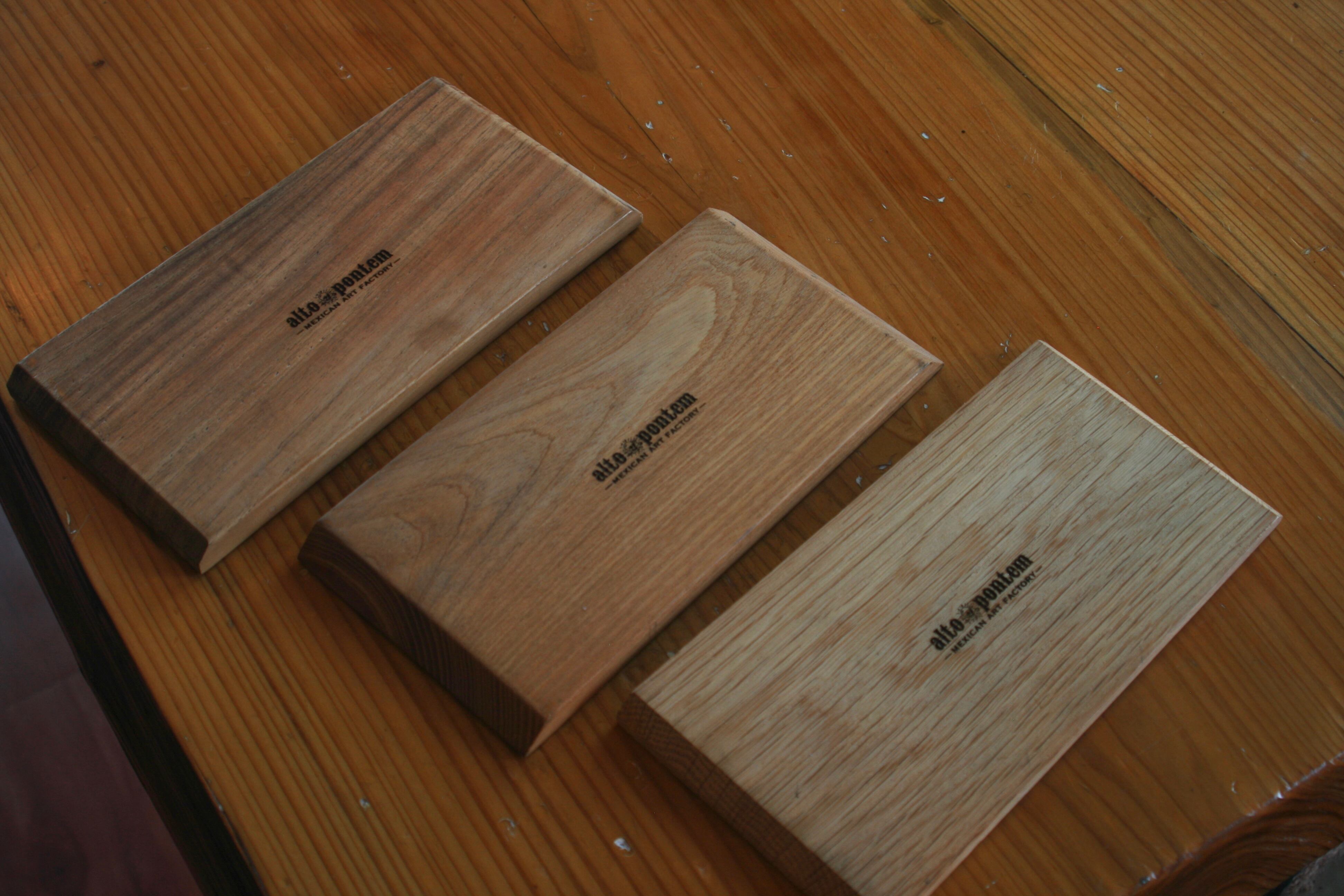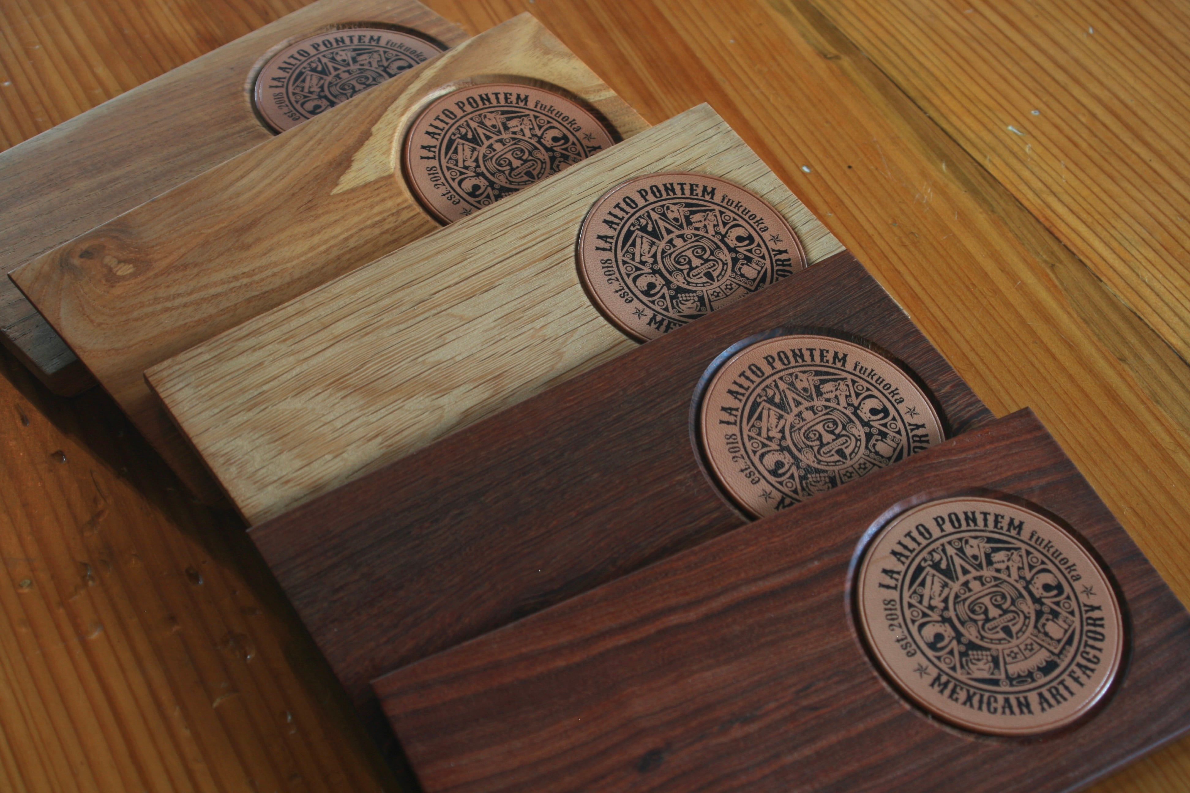 木に窪みをつけ昭南多脂革のコースターをはってます!