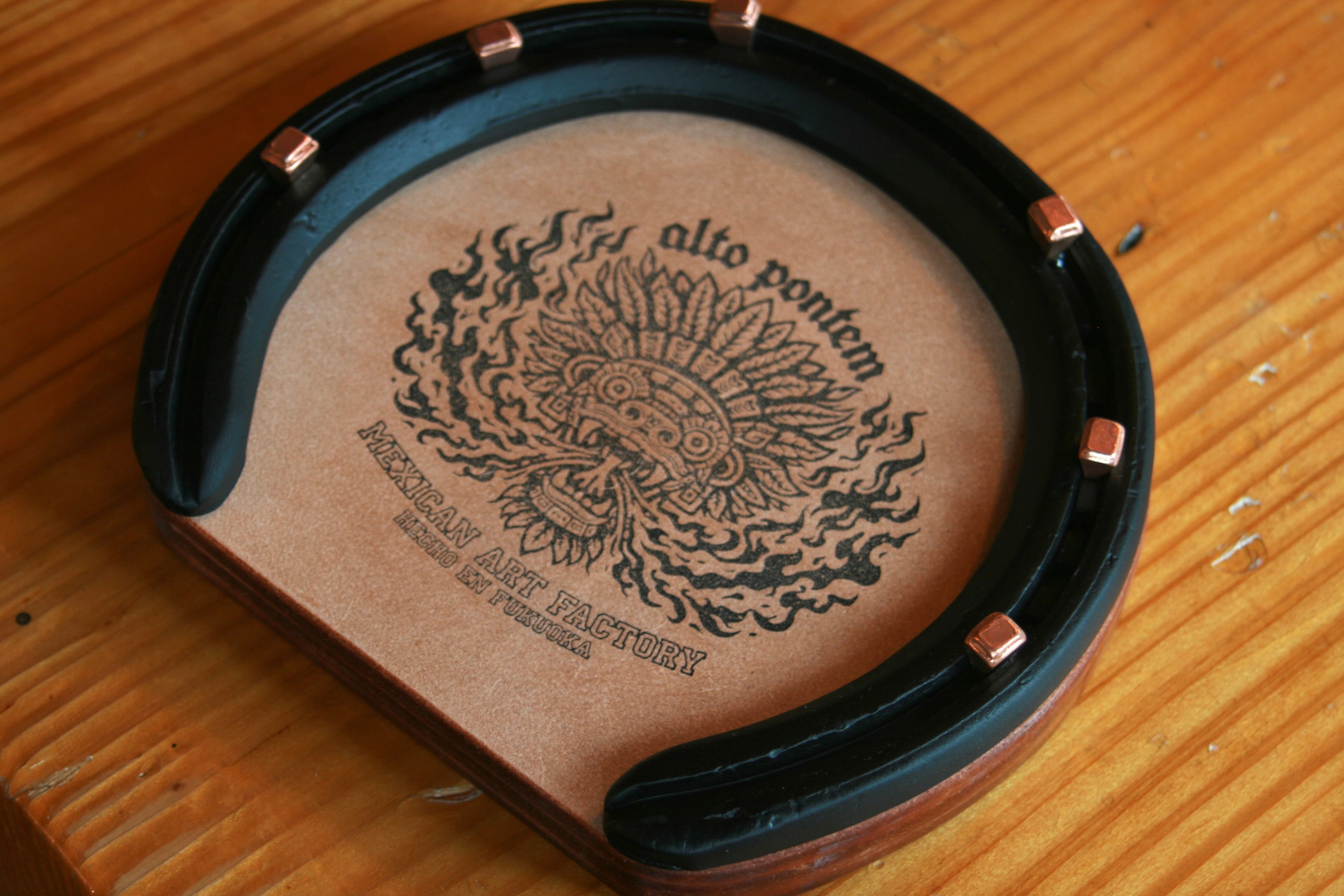 積み革が木の断面のような、馬蹄のような雰囲気でゴツく重厚感があり最高に洒落たコースターです!