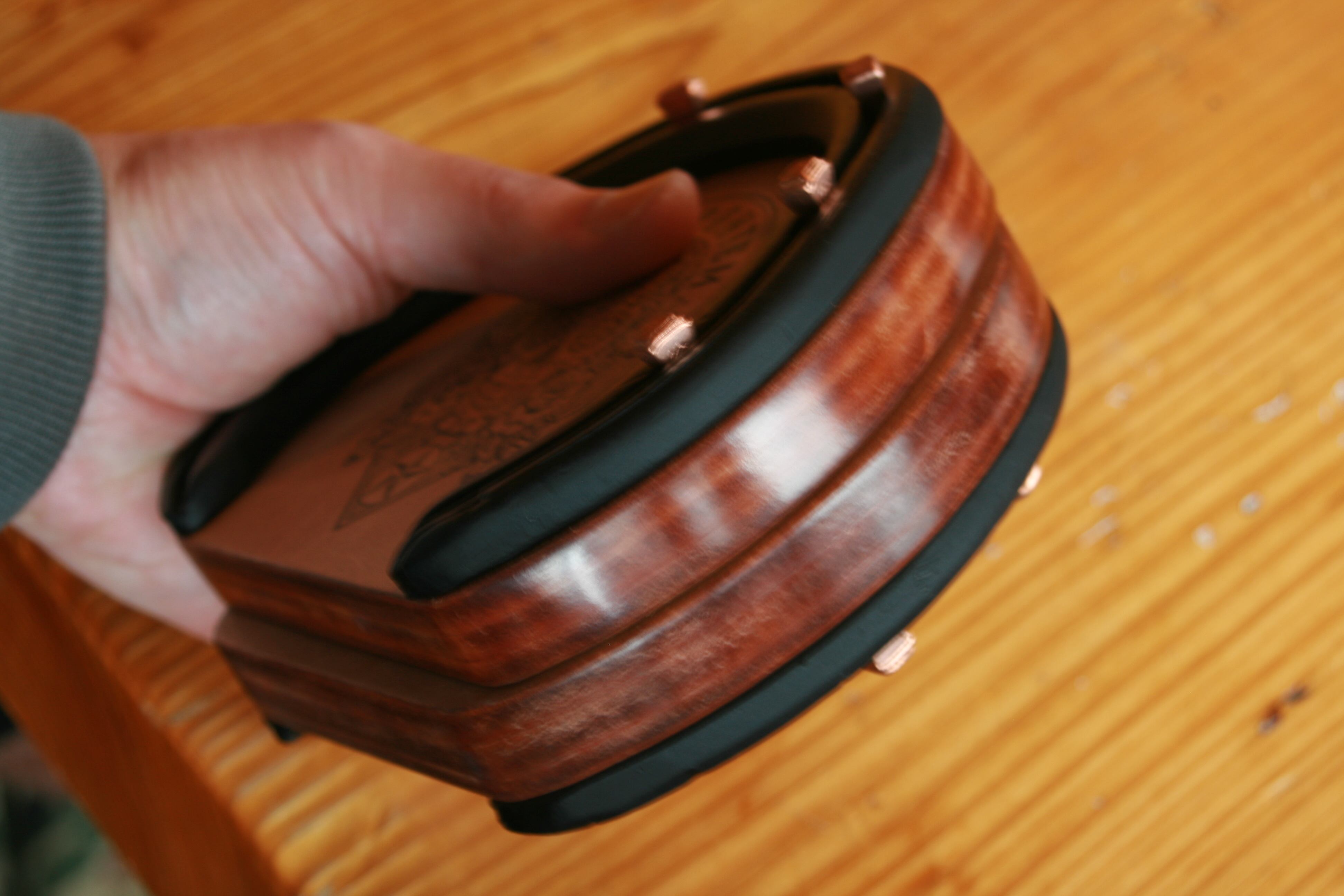 革はギチギチに詰まった3~4mm厚の昭南の多脂ベンズトコ革を4~5層に積み重ね、コバ(側面)はカルナバ蝋を熱したコテで溶かし入れ磨いてます。