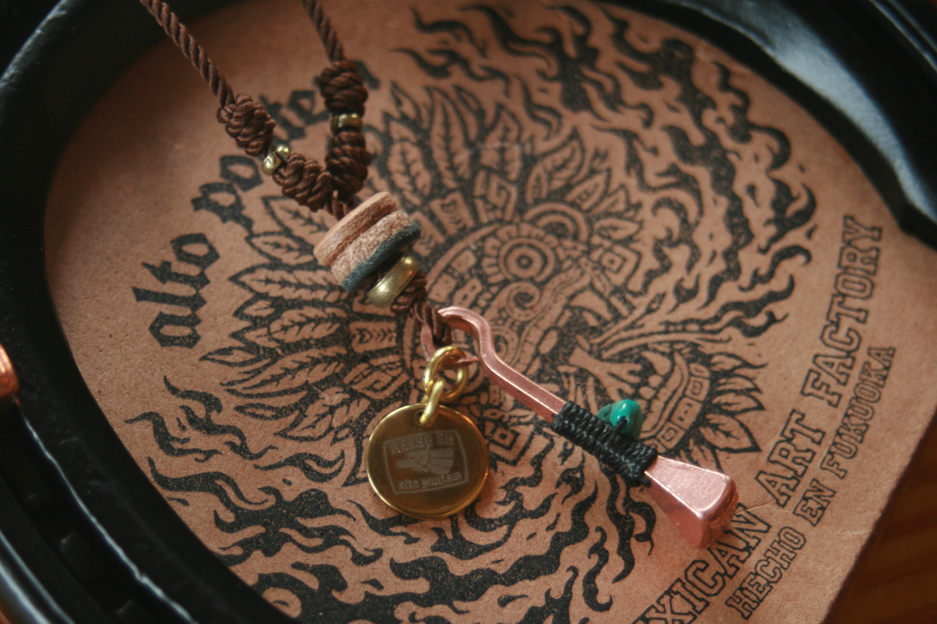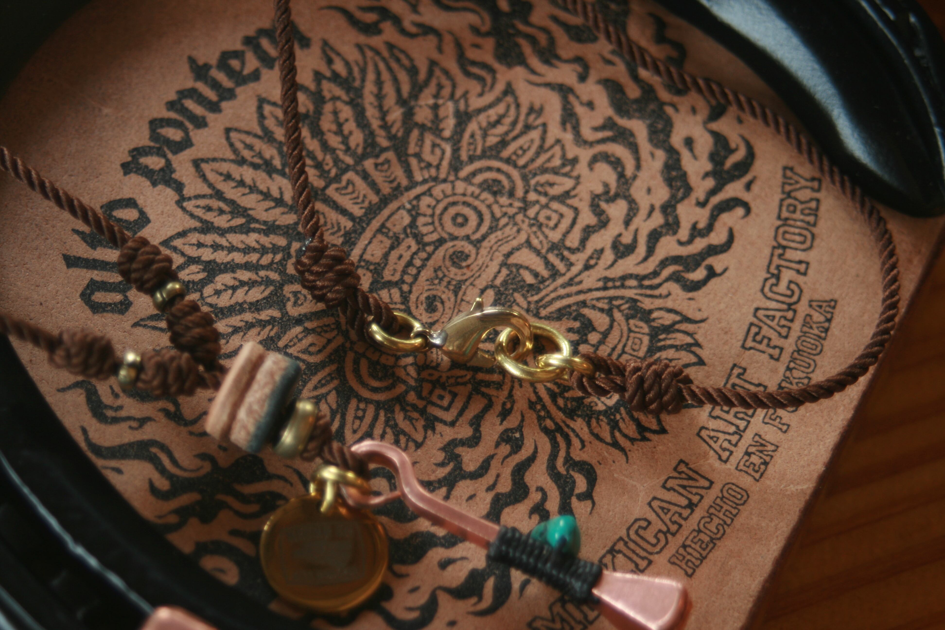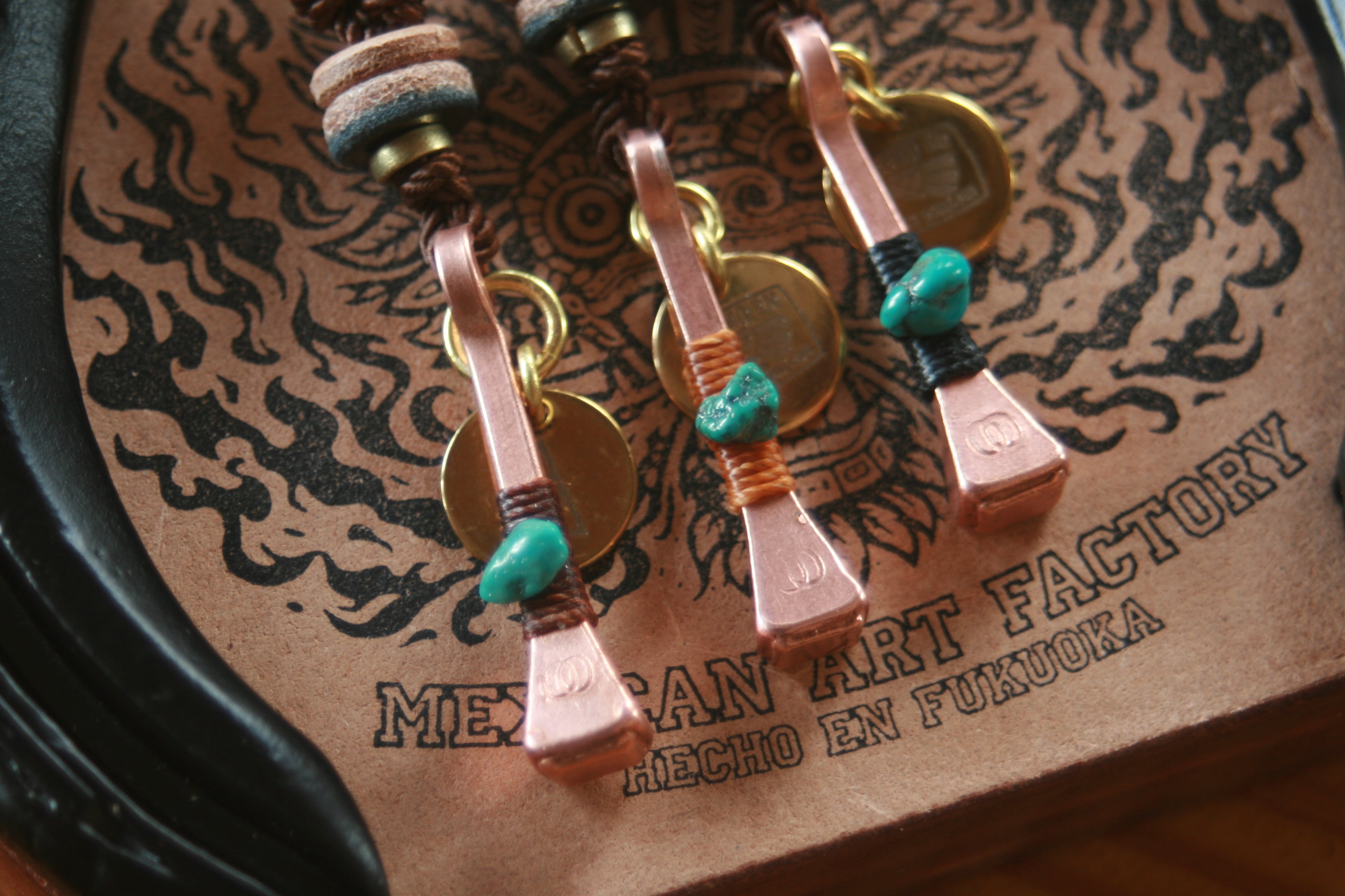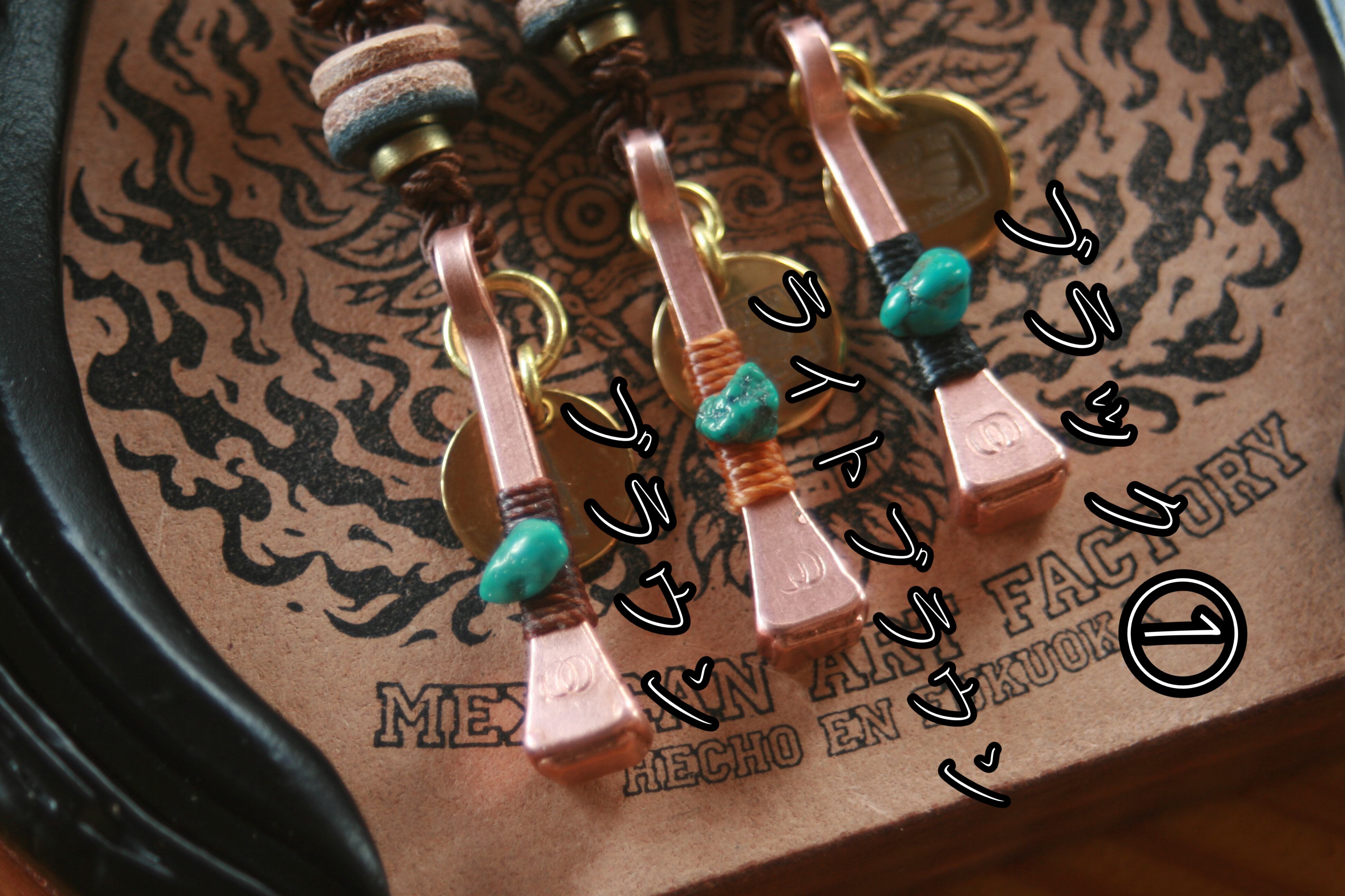 当工房では通常アクセサリーには別の蝋引き糸を使用していますが、今回のコンセプトに因み撚り糸を使いました。理由はウエスタンと言えばウエスタンロープ、あの太い撚り糸のロープをイメージしてこの糸とメキシカンツイストコードを合わせました。