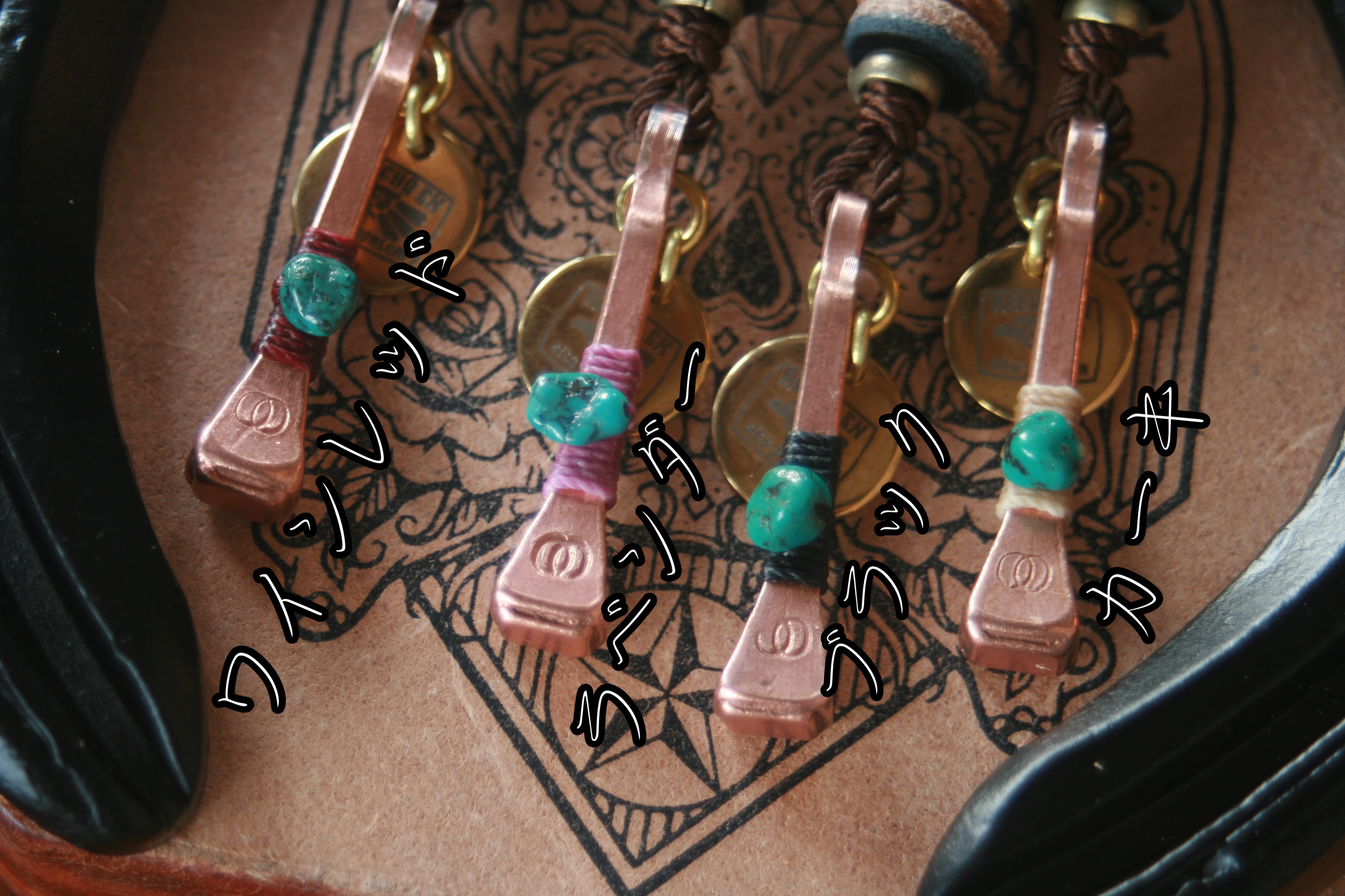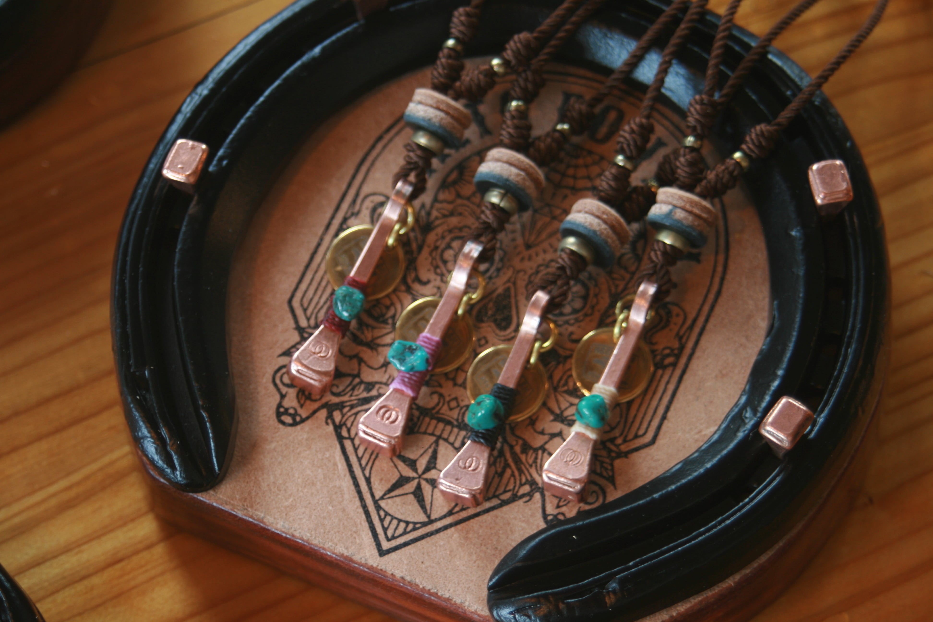馬の蹄鉄を固定するための蹄釘をペンダントトップへと加工を施し、ターコイズをウエスタンロープをイメージして撚り糸で巻き付けました。