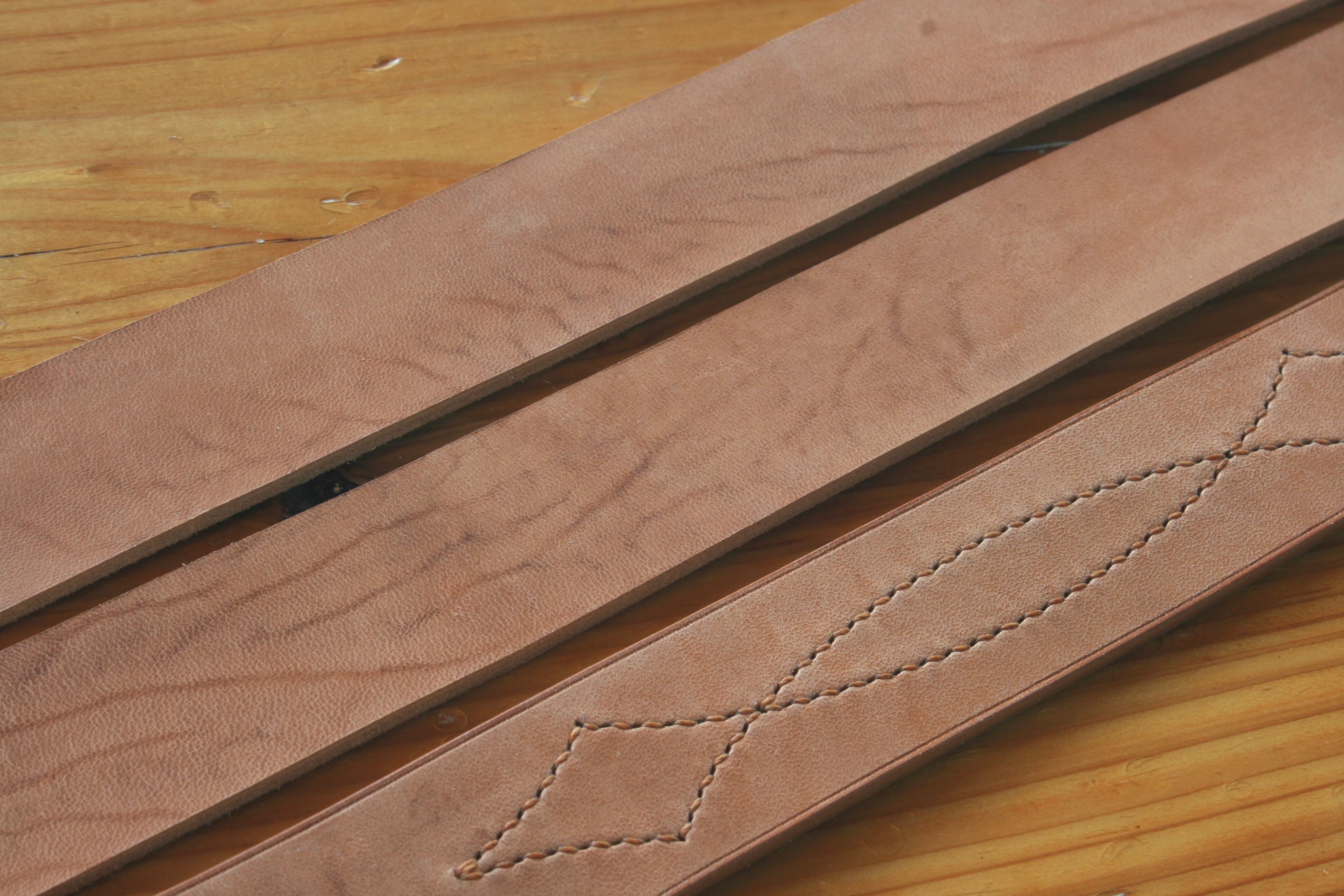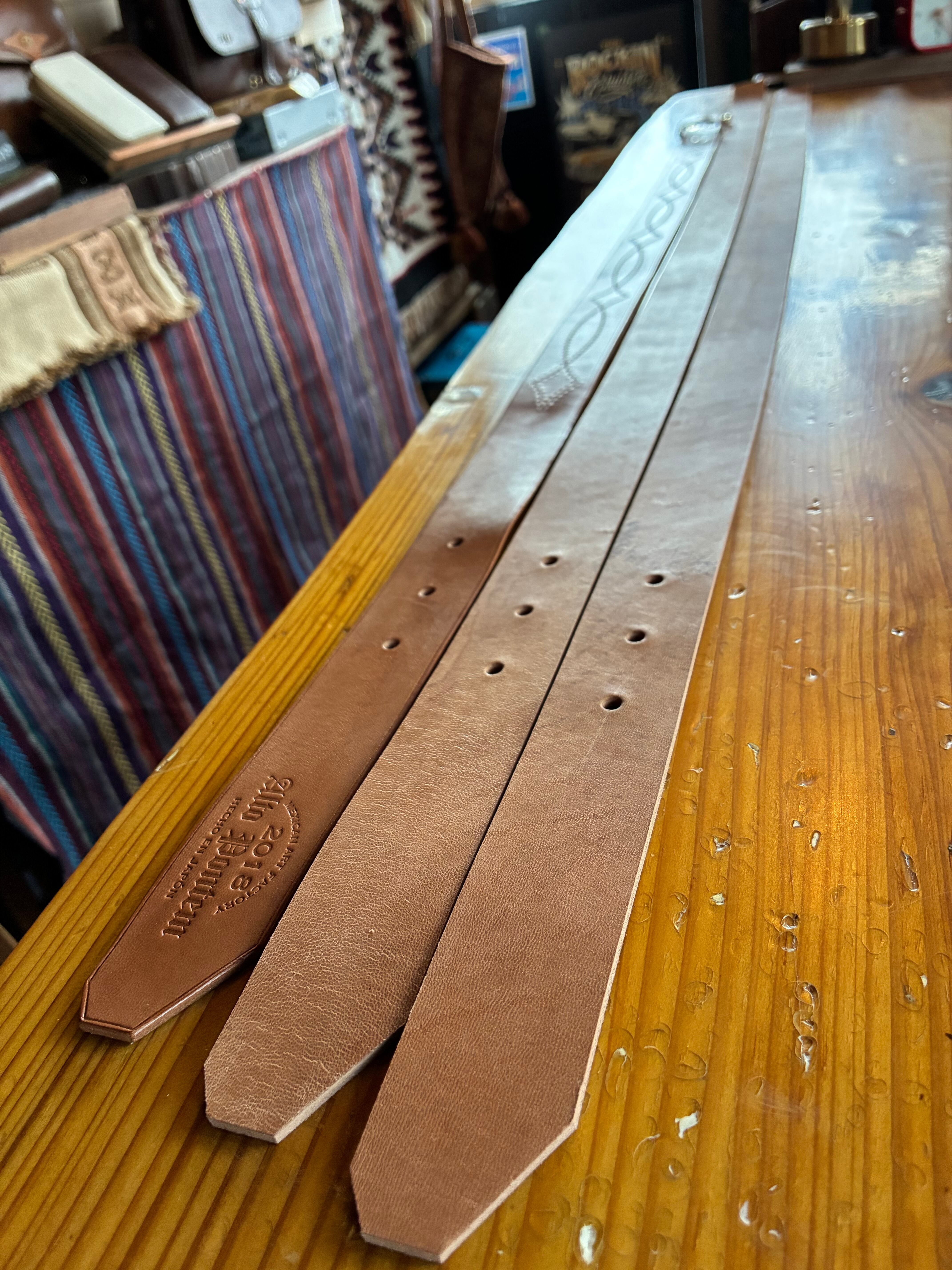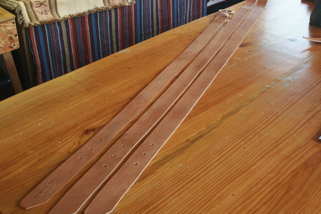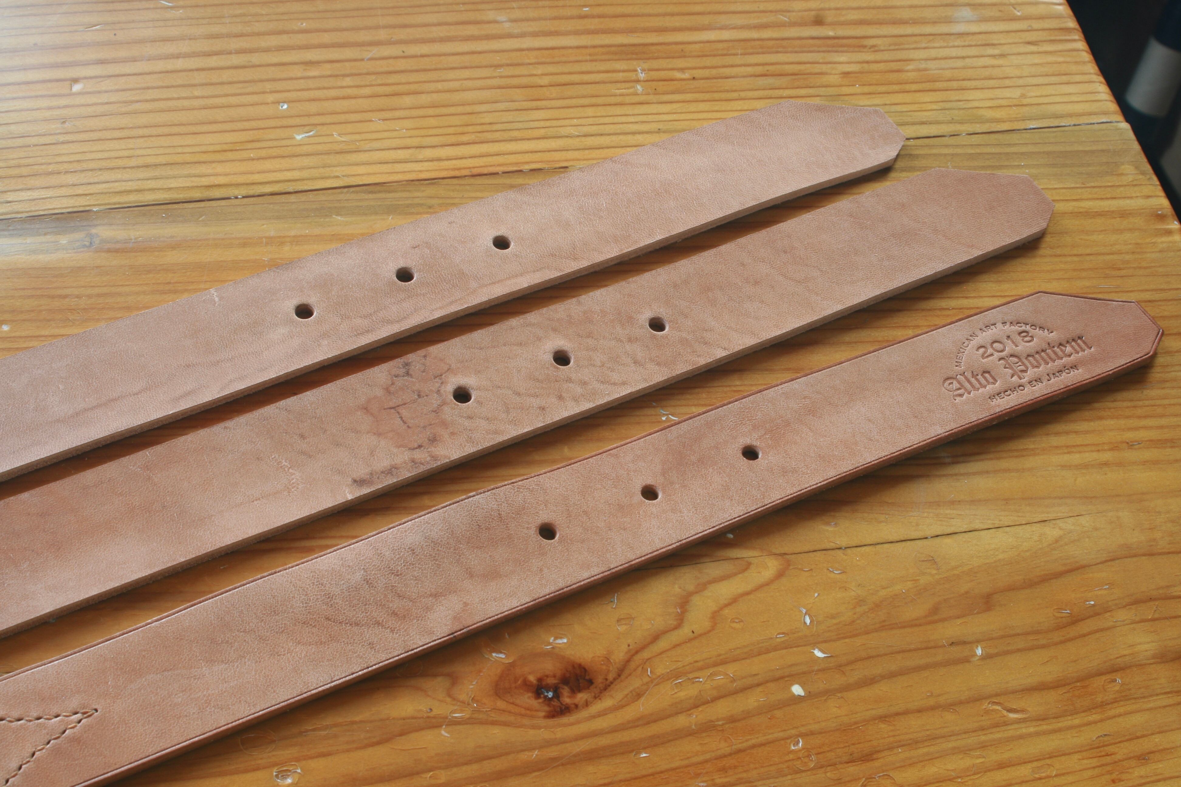 13枚目の写真に写る一番左のベルトが最終仕上げ後で、右2本は未仕上げです。