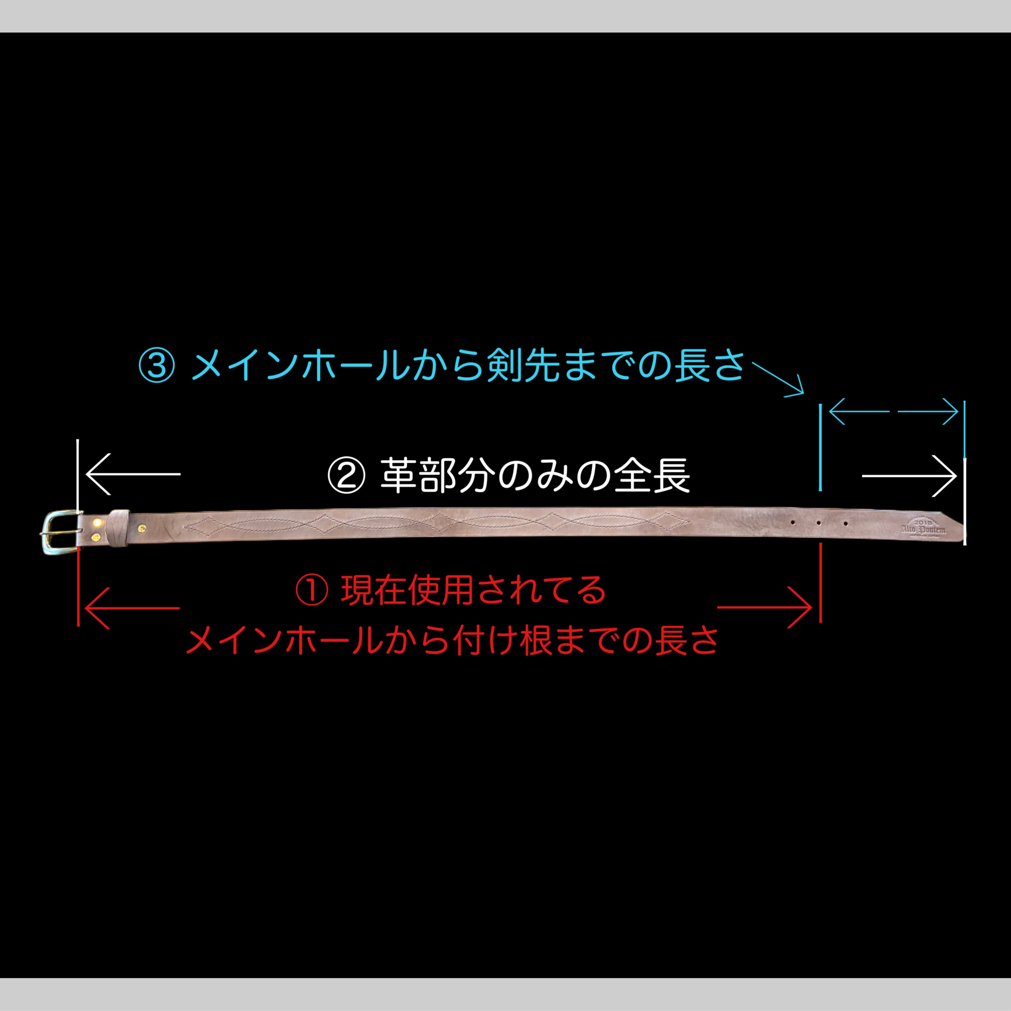 ⬛︎写真4枚目をご覧になり現在お手持ちの使用されているベルトを元に、①、②、③までの長さをメモ欄へご記入下さい。