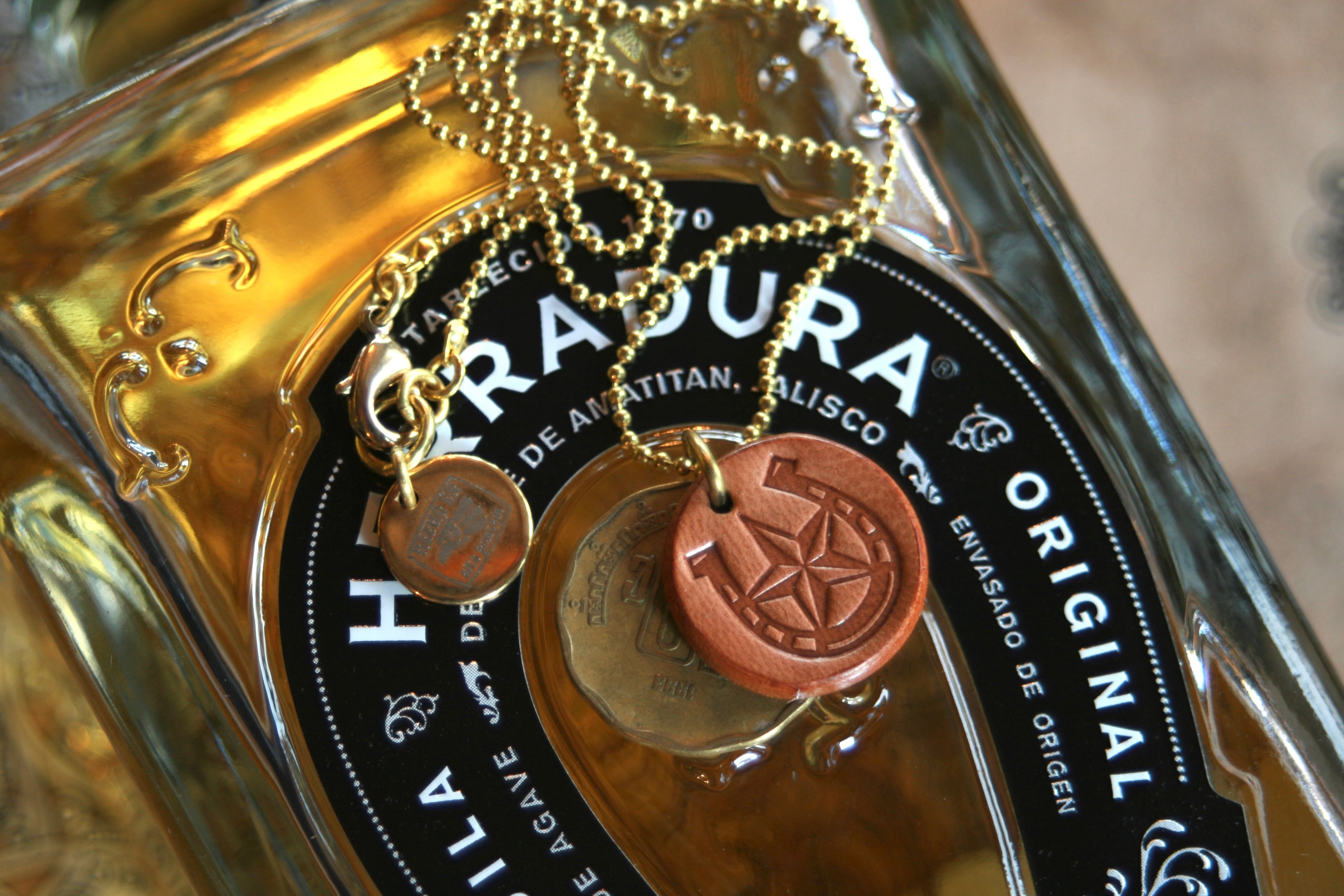 細身の真鍮ボールチェーンと50センタボ硬貨に馬革へ蹄鉄×ノーティカルスターの当工房の刻印。