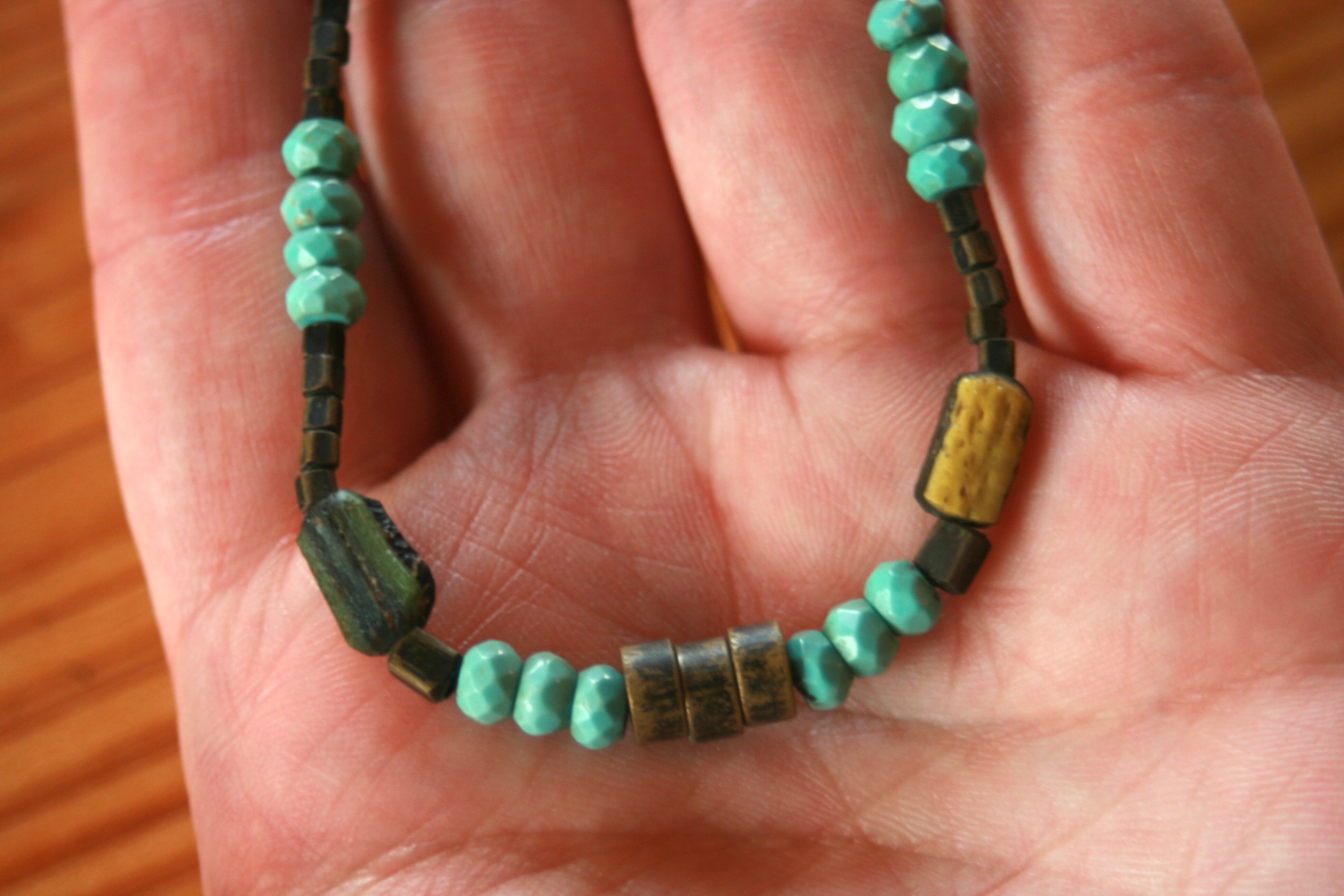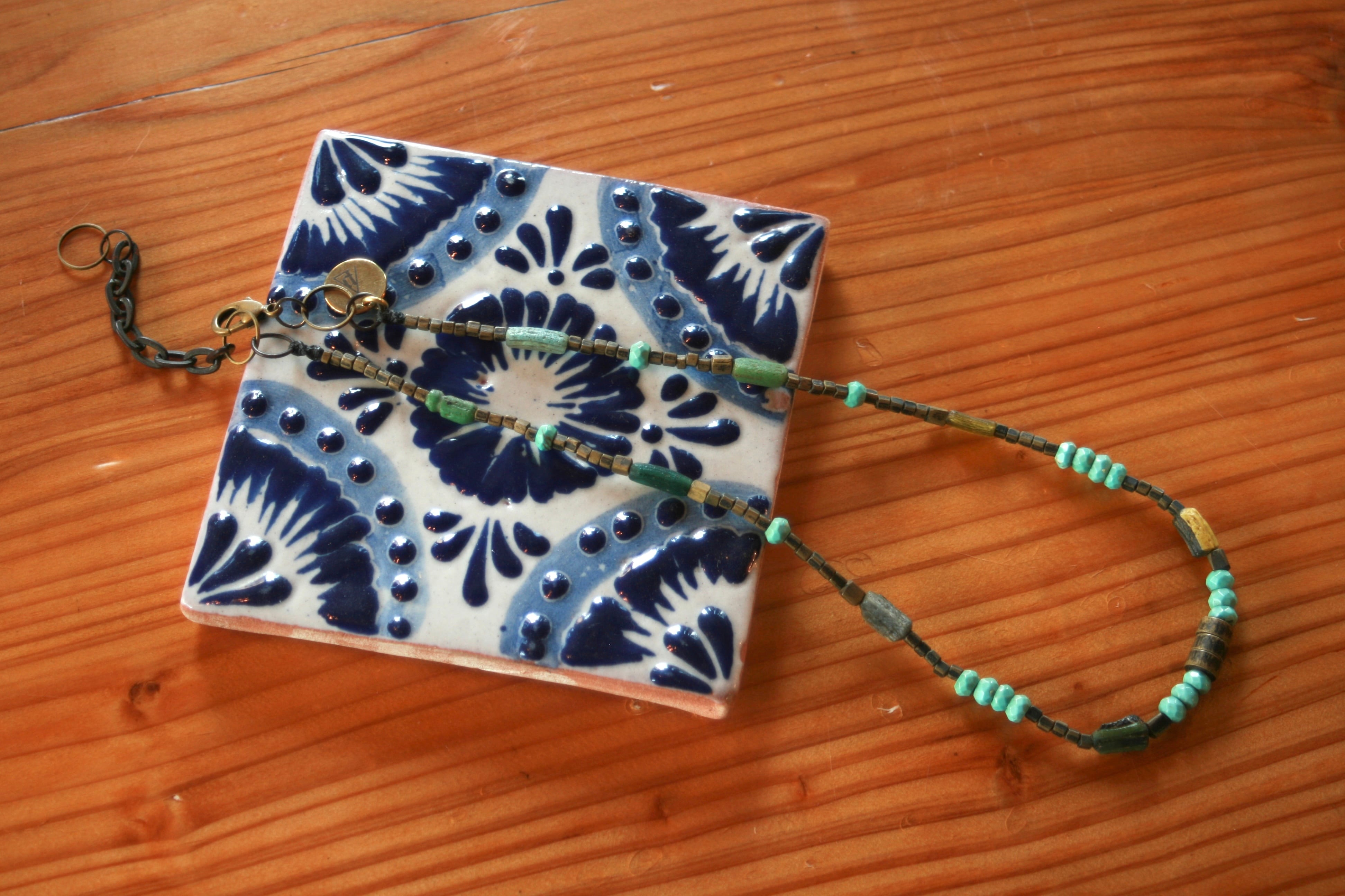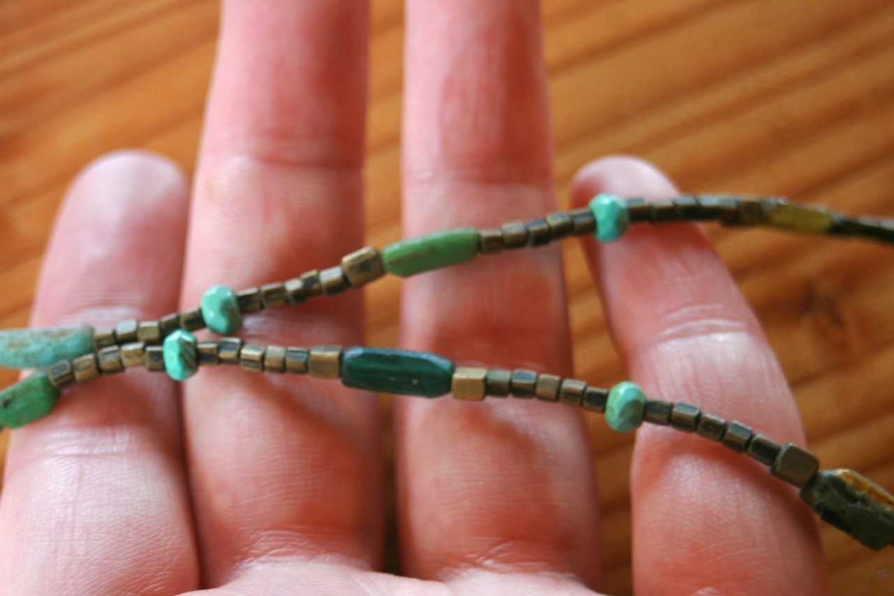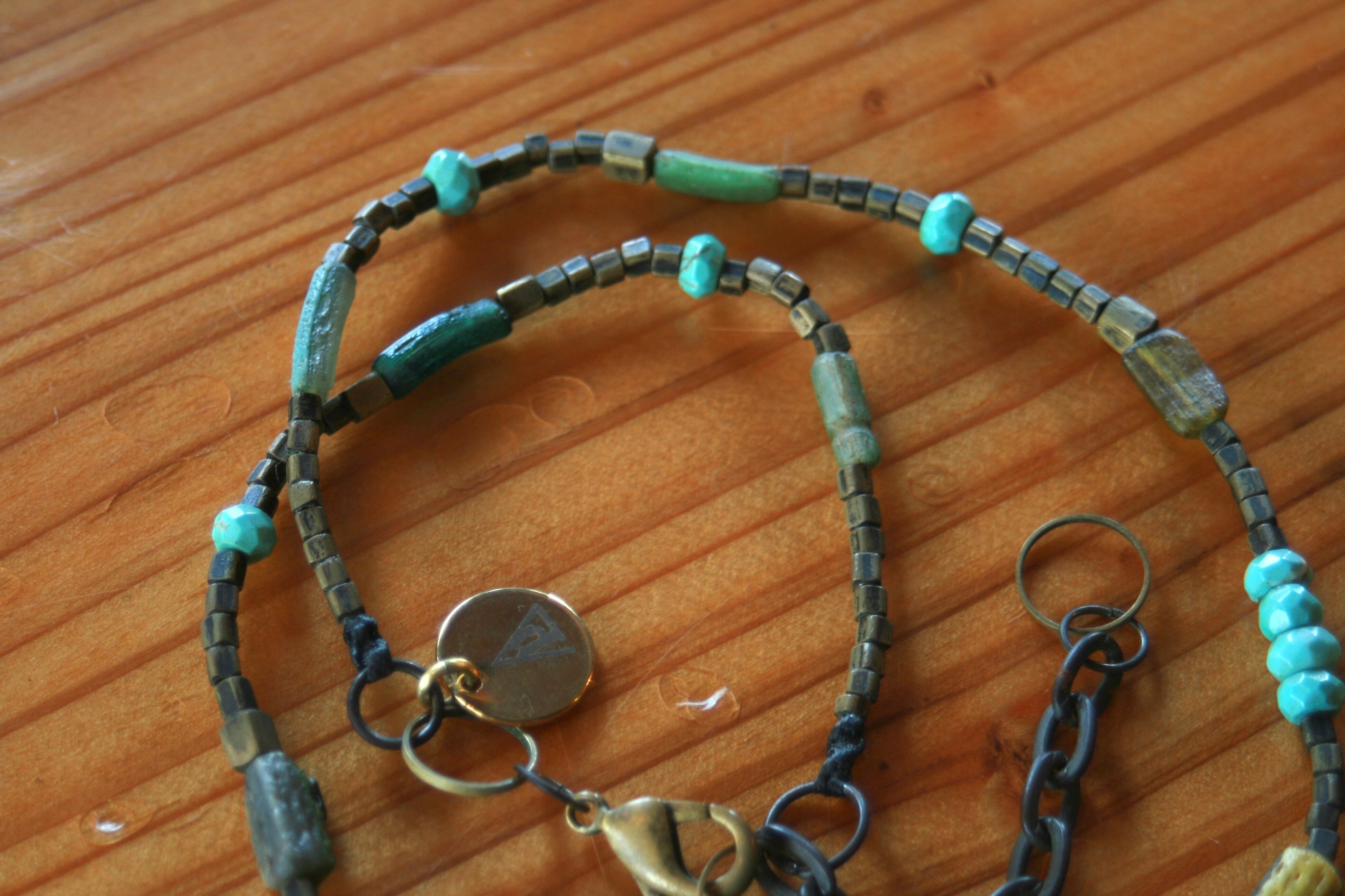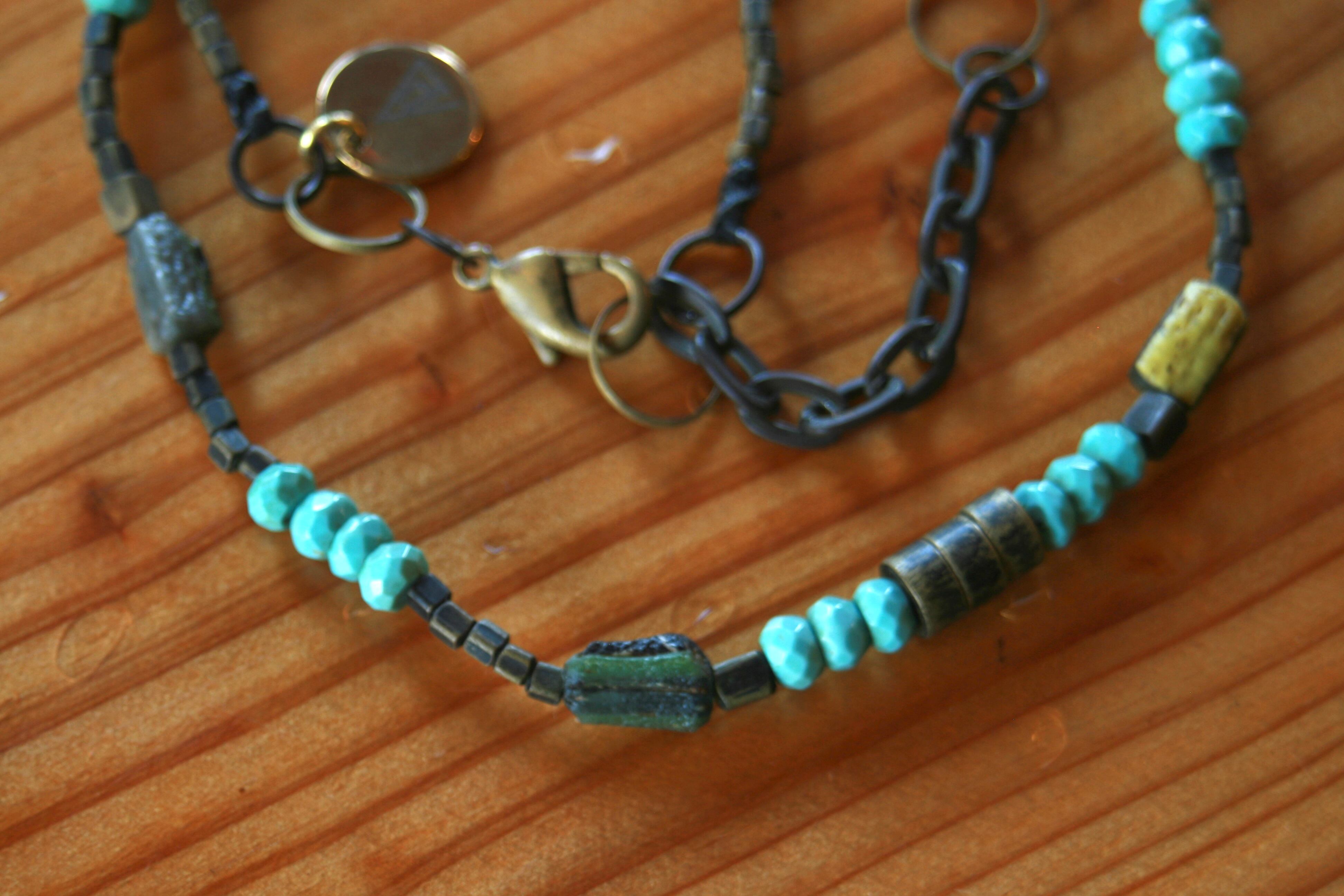 そして、全体の古めかしいビーズ達に合わせて留め具は酸化加工を施して薄黒くしています。