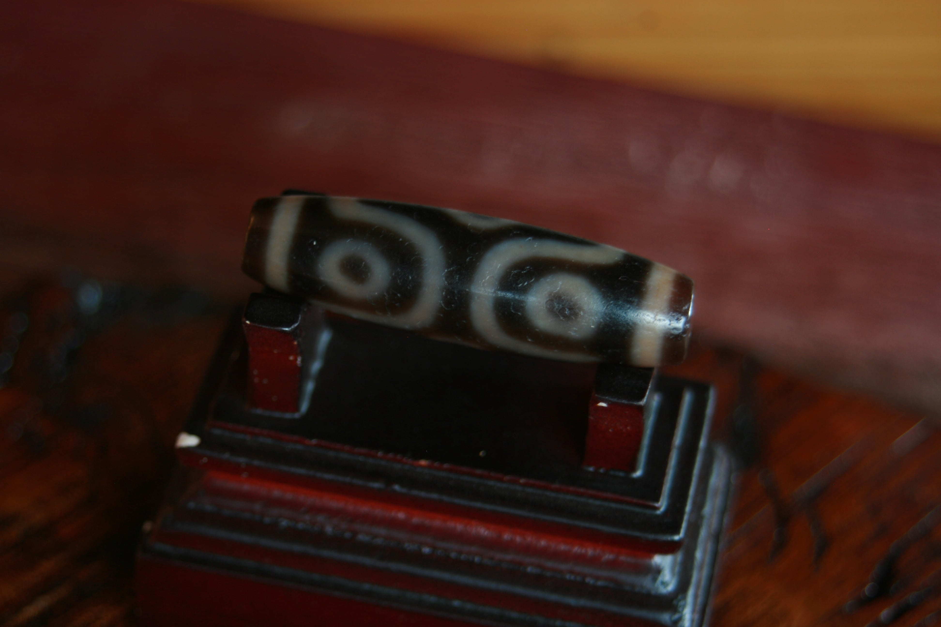 天珠そのものは神聖で決められた鉱山の瑪瑙(めのう)のみを使い、この形に削られ、チベット仏教に伝わる薬液を用いて絵付けがなされ、炉にて焼き付けされこのような模様が完成します。1から10まで僧侶だけで作られる未だに門外不出の製法により作られています。