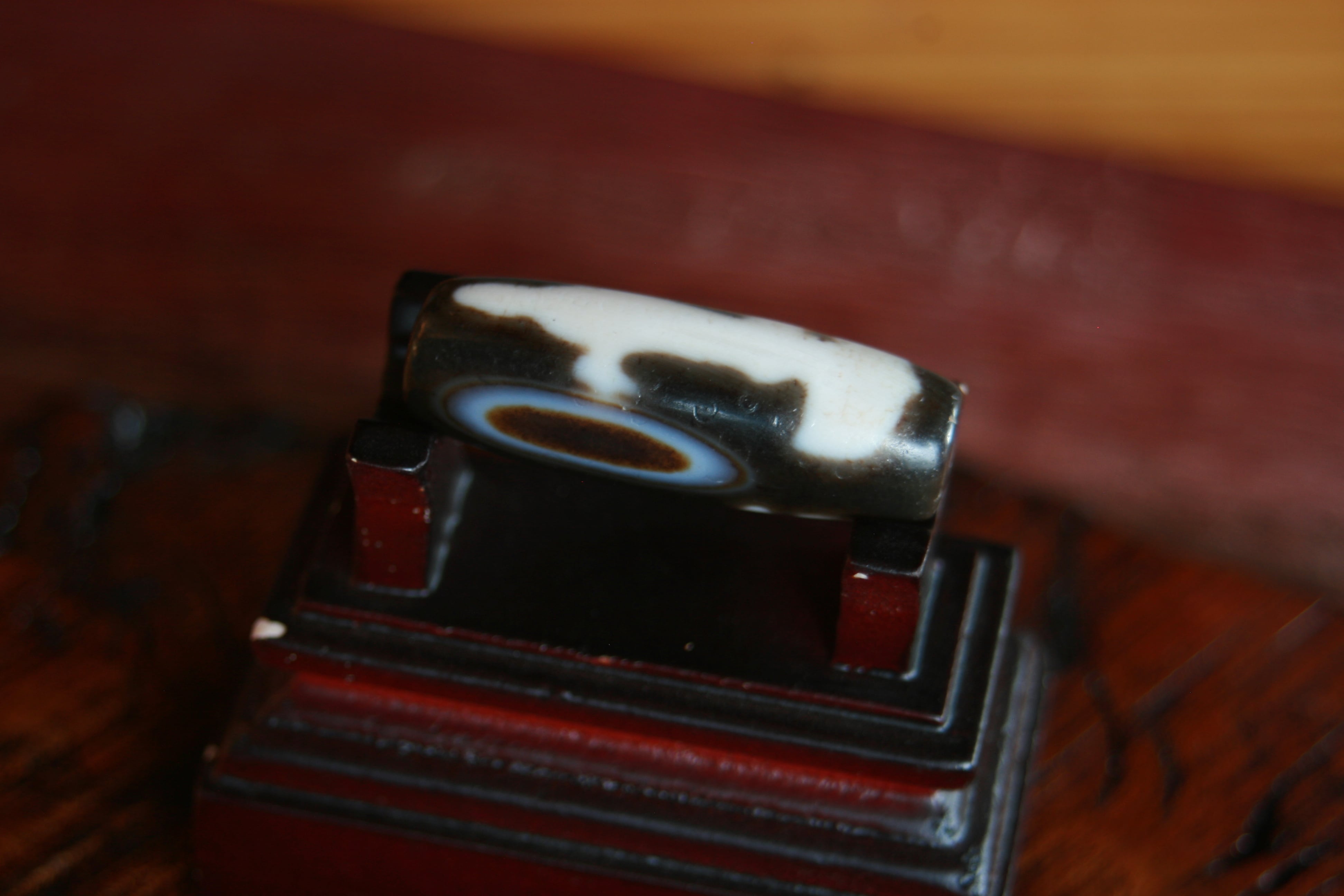 天珠そのものは神聖で決められた鉱山の瑪瑙(めのう)のみを使い、この形に削られ、チベット仏教に伝わる薬液を用いて絵付けがなされ、炉にて焼き付けされこのような模様が完成します。1から10まで僧侶だけで作られる未だに門外不出の製法により作られています。