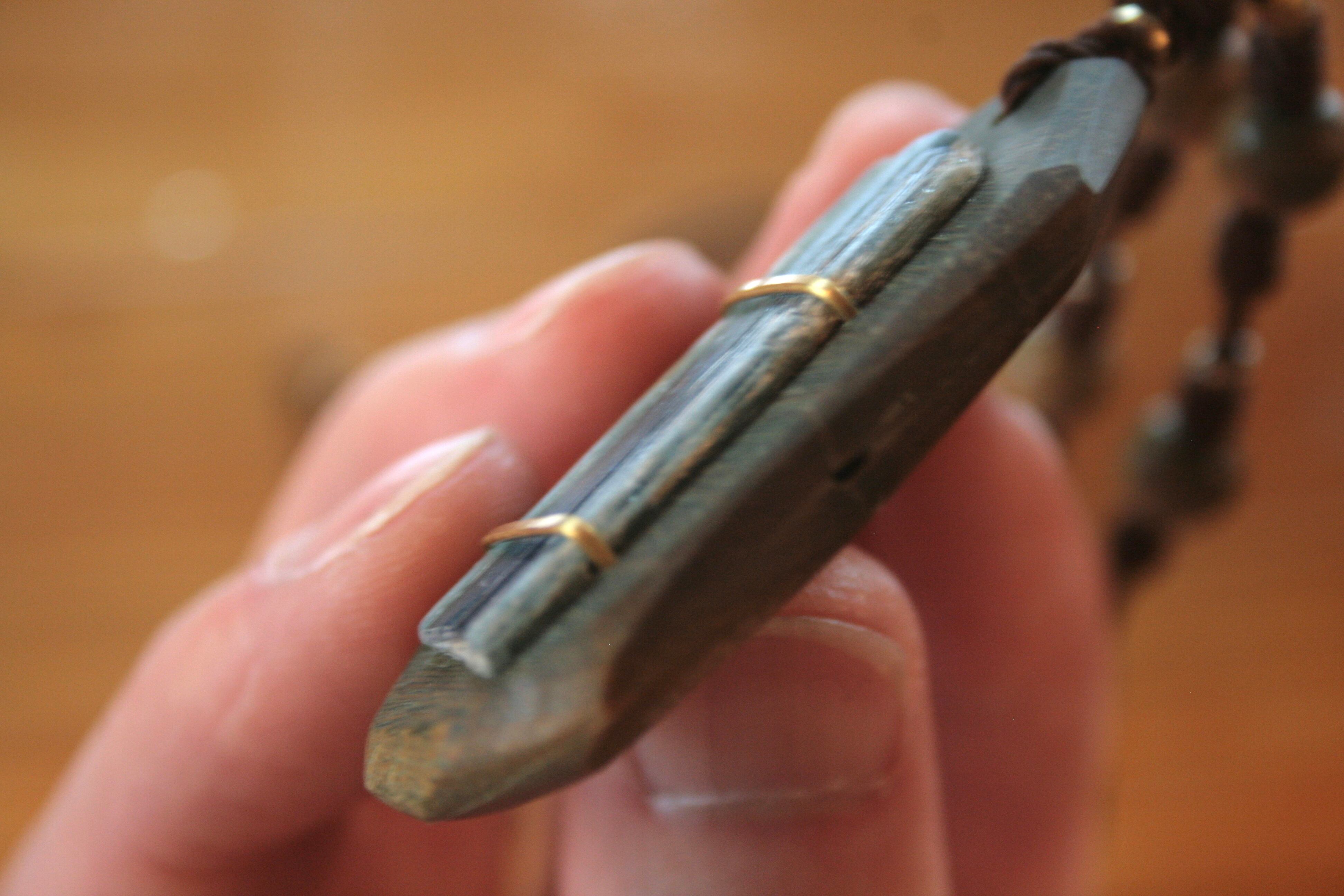 とても脆く、研磨したりする加工に向かない石なのと、原石その物の形状が針のように細く伸びるため大きな石が採れず、