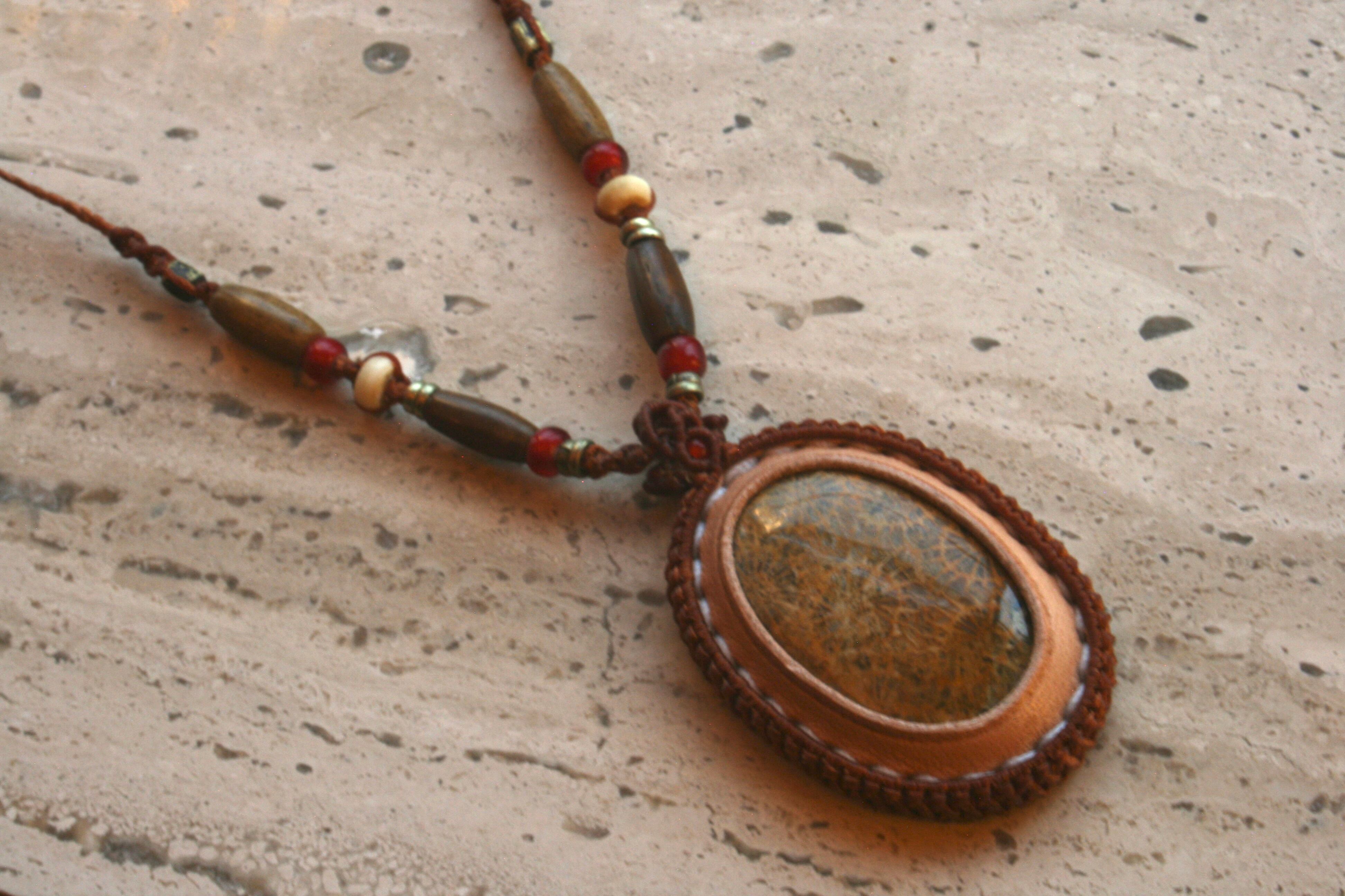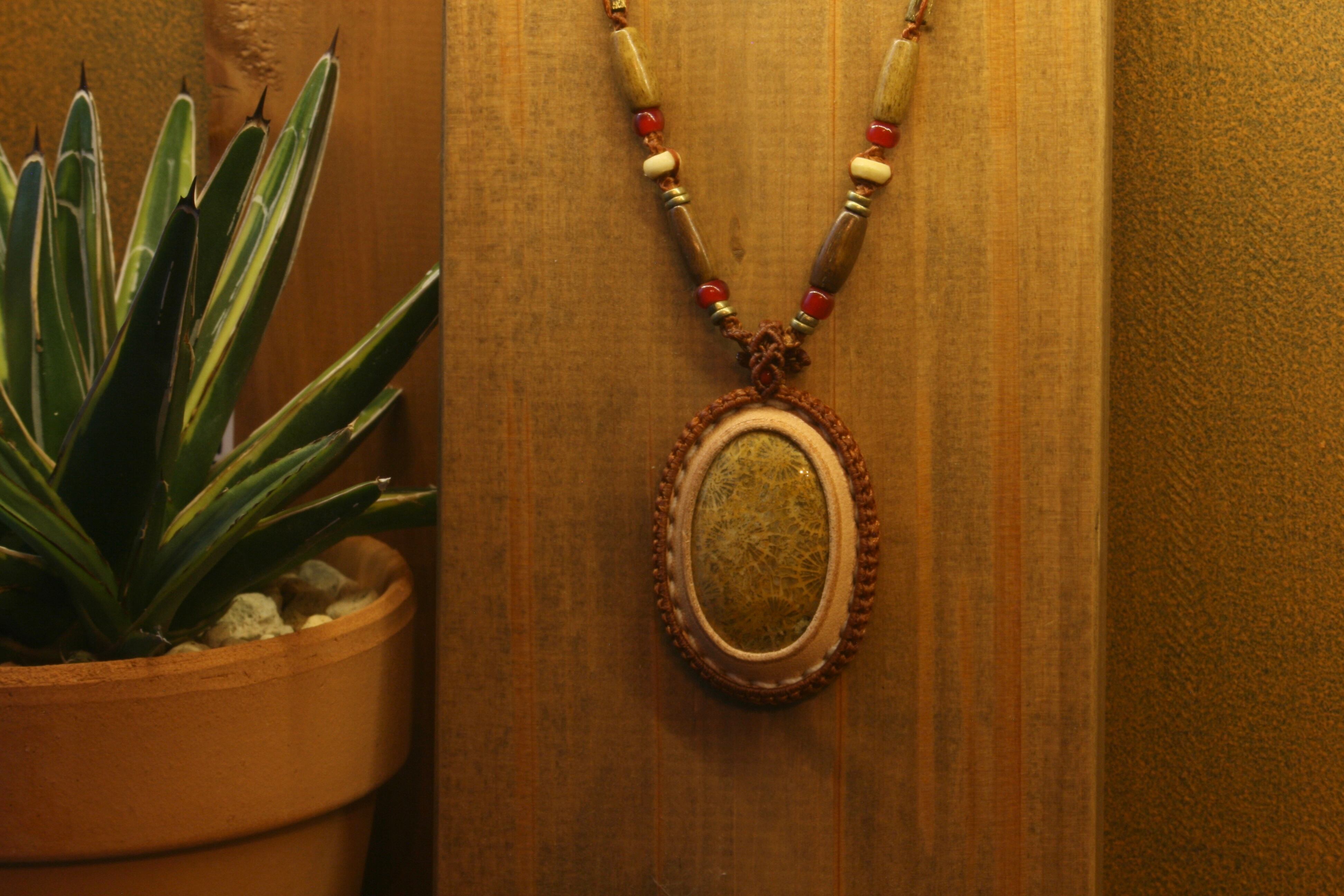 【フォシルコーラル】天然石の革包MACRAME ネックレス