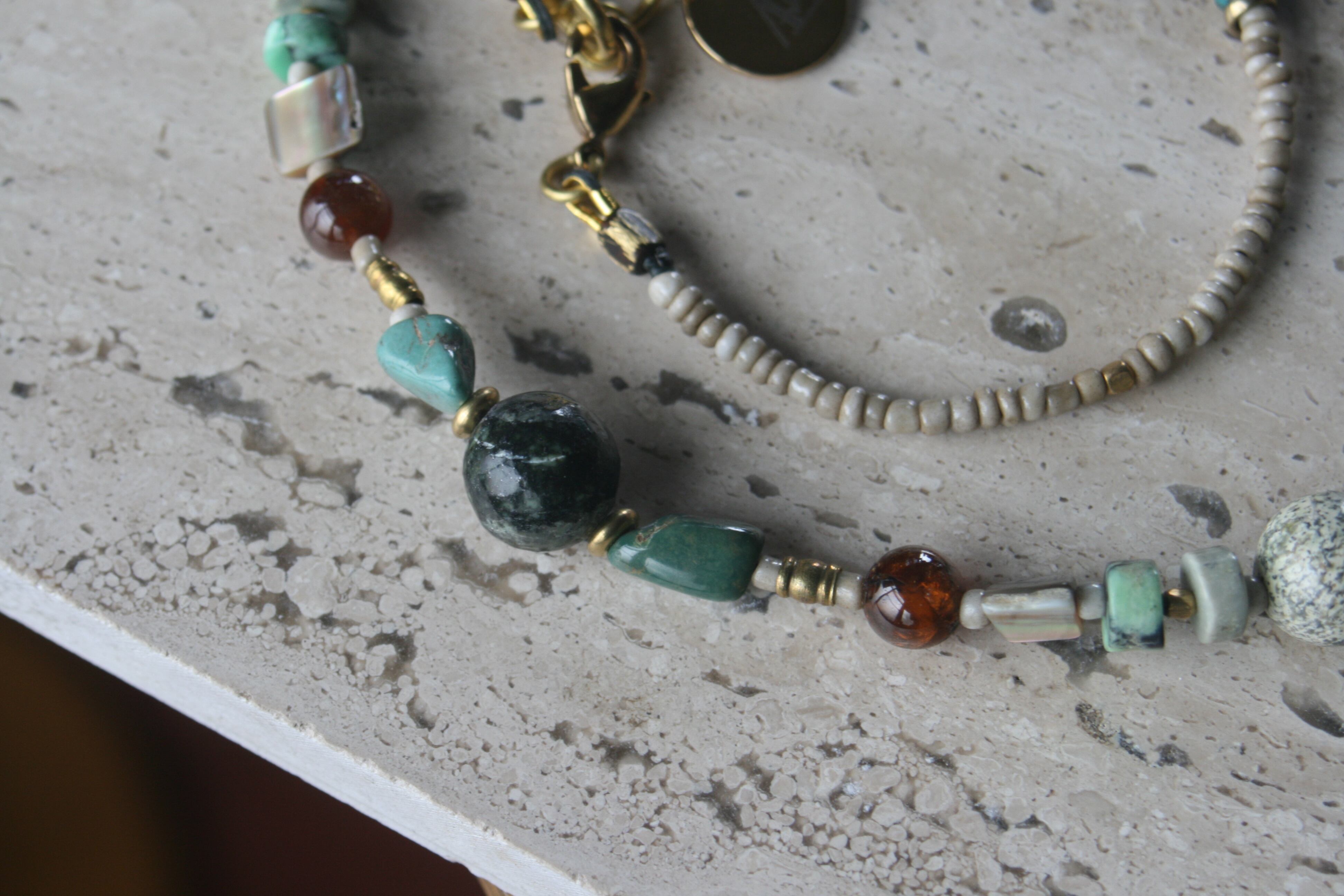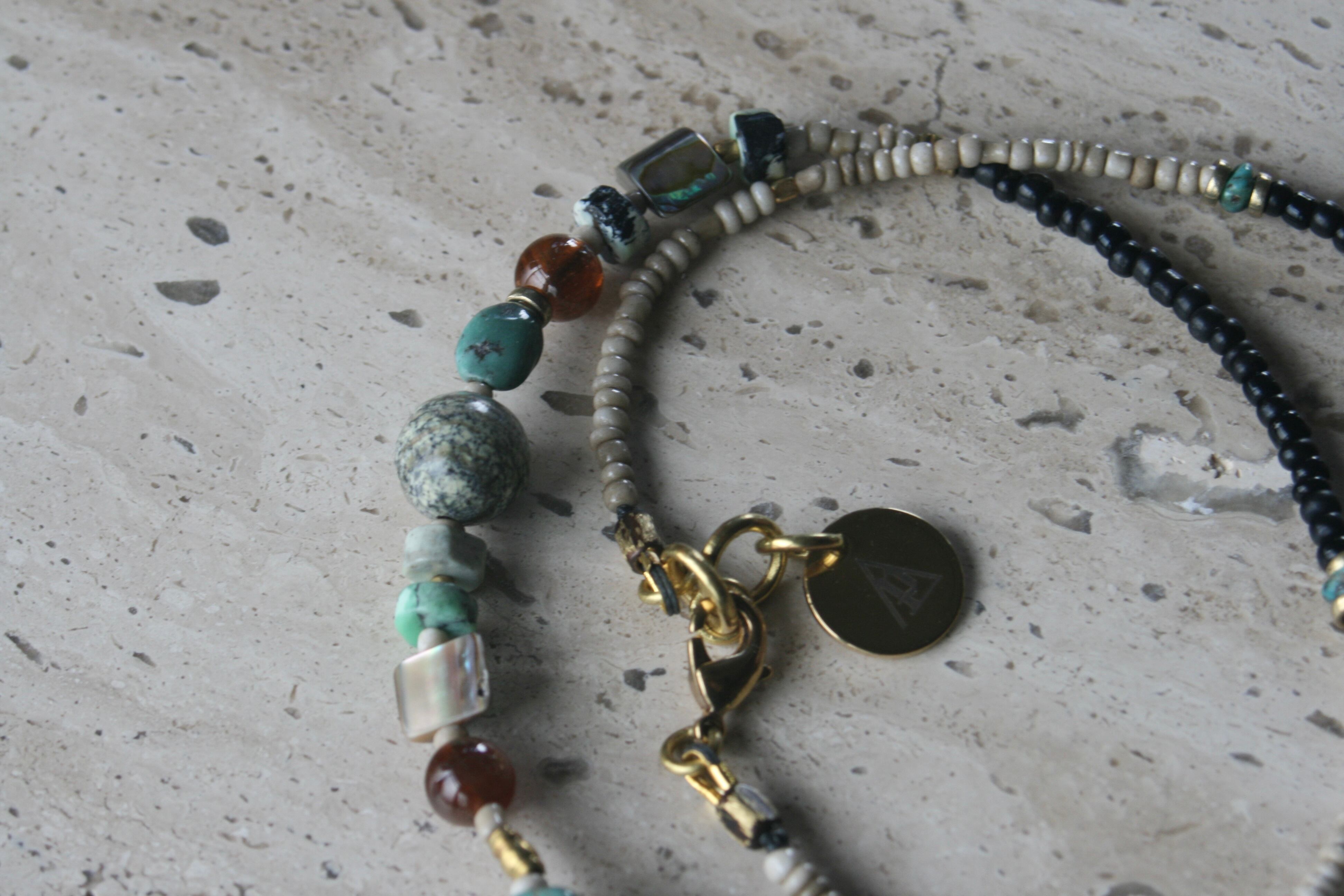 イタリア、アフリカ、メキシコ、インドネシア、ネパール等の民族ビーズ、トレードビーズを使用。